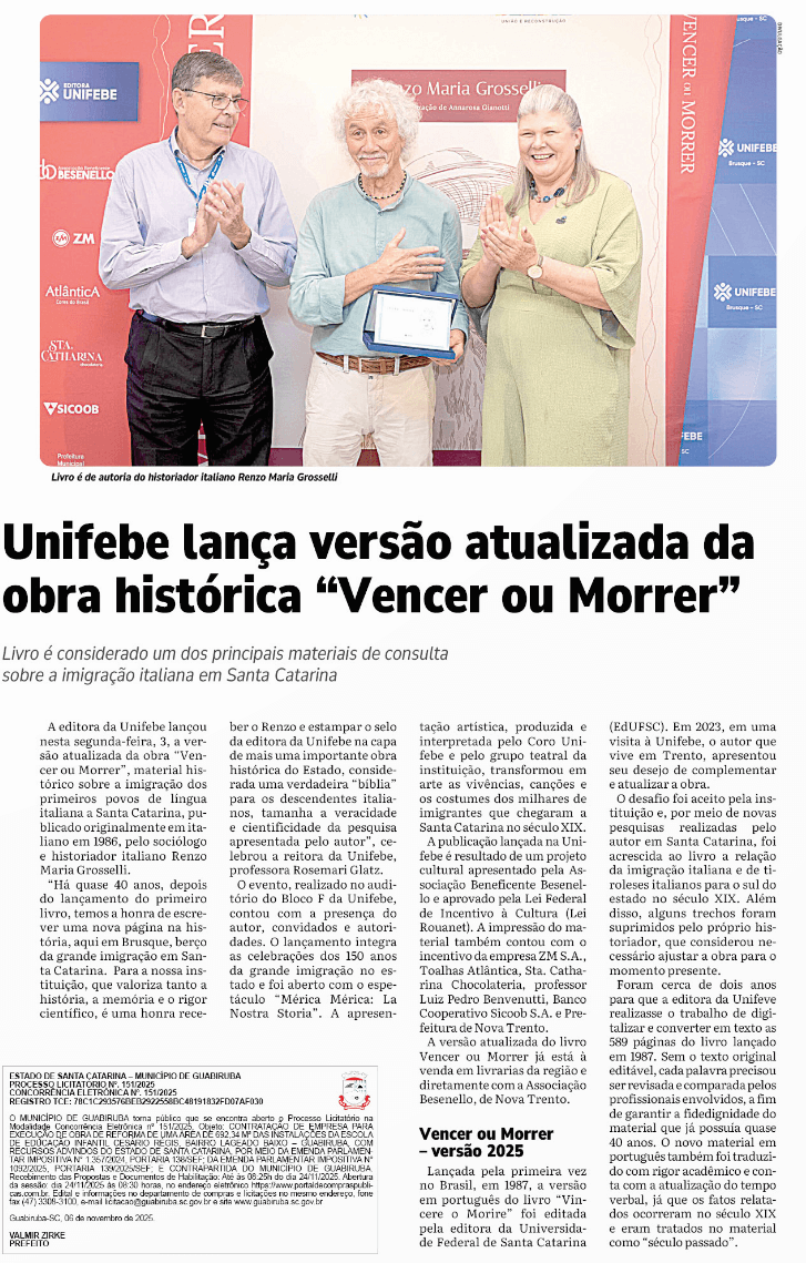 06 de Novembro de 2025 – O Município Online – Unifebe lança versão atualizada da obra histórica ” Vencer ou Morrer”.