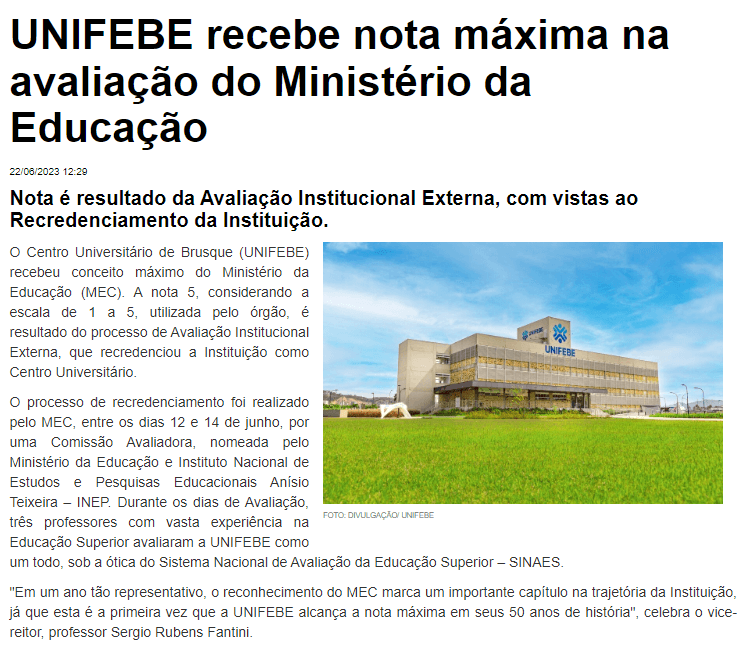 22 de junho de 2023-jornal metas -UNIFEBE recebe nota máxima na avaliação do Ministério da Educação.