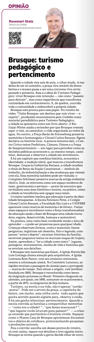 30 de Janeiro de 2026 – O Município Online – Brusque: turismo pedagógico e pertencimento.