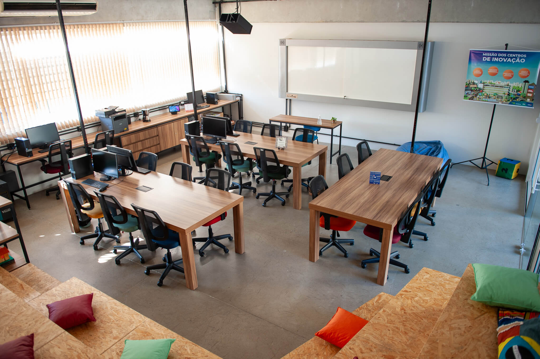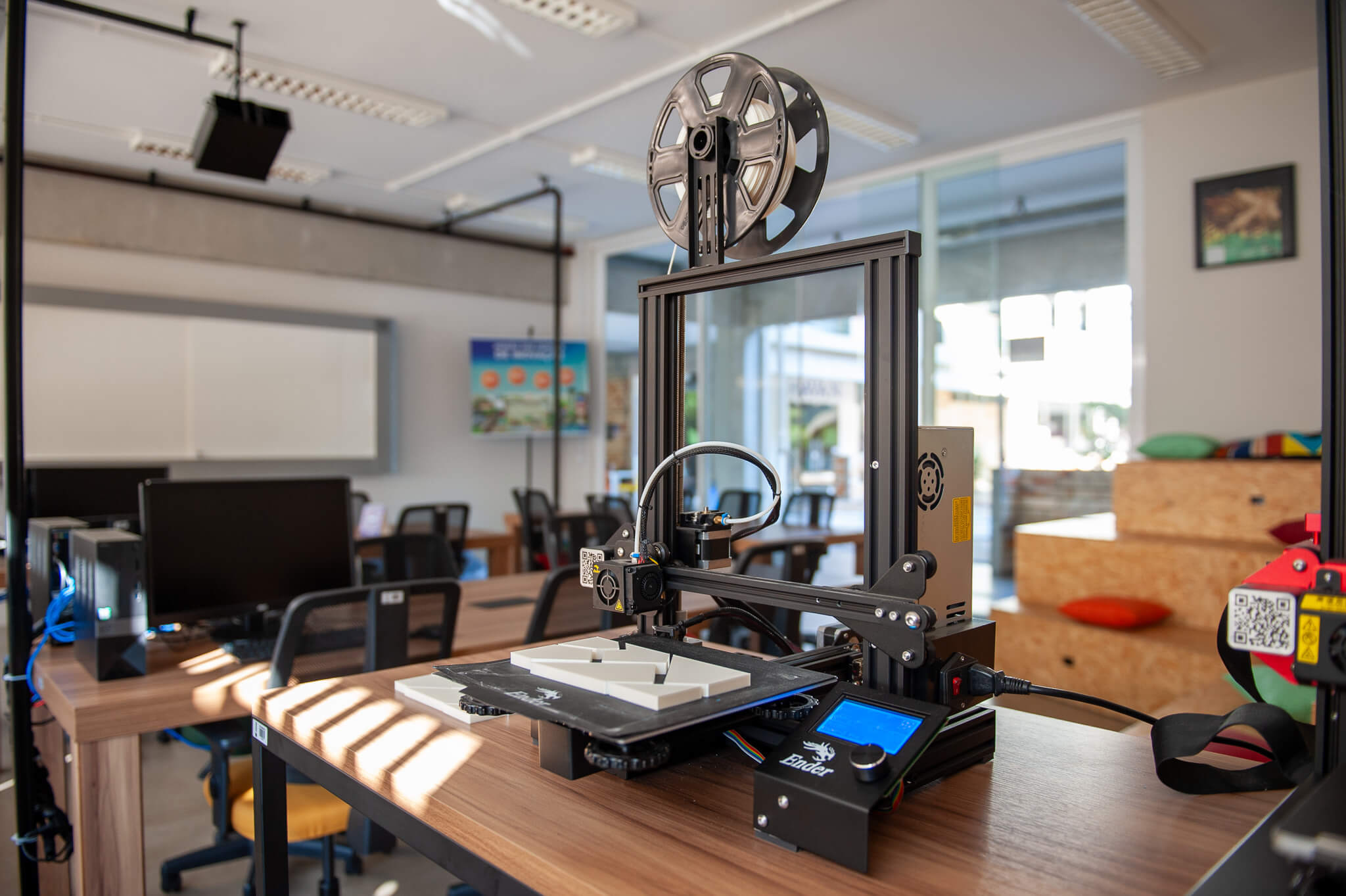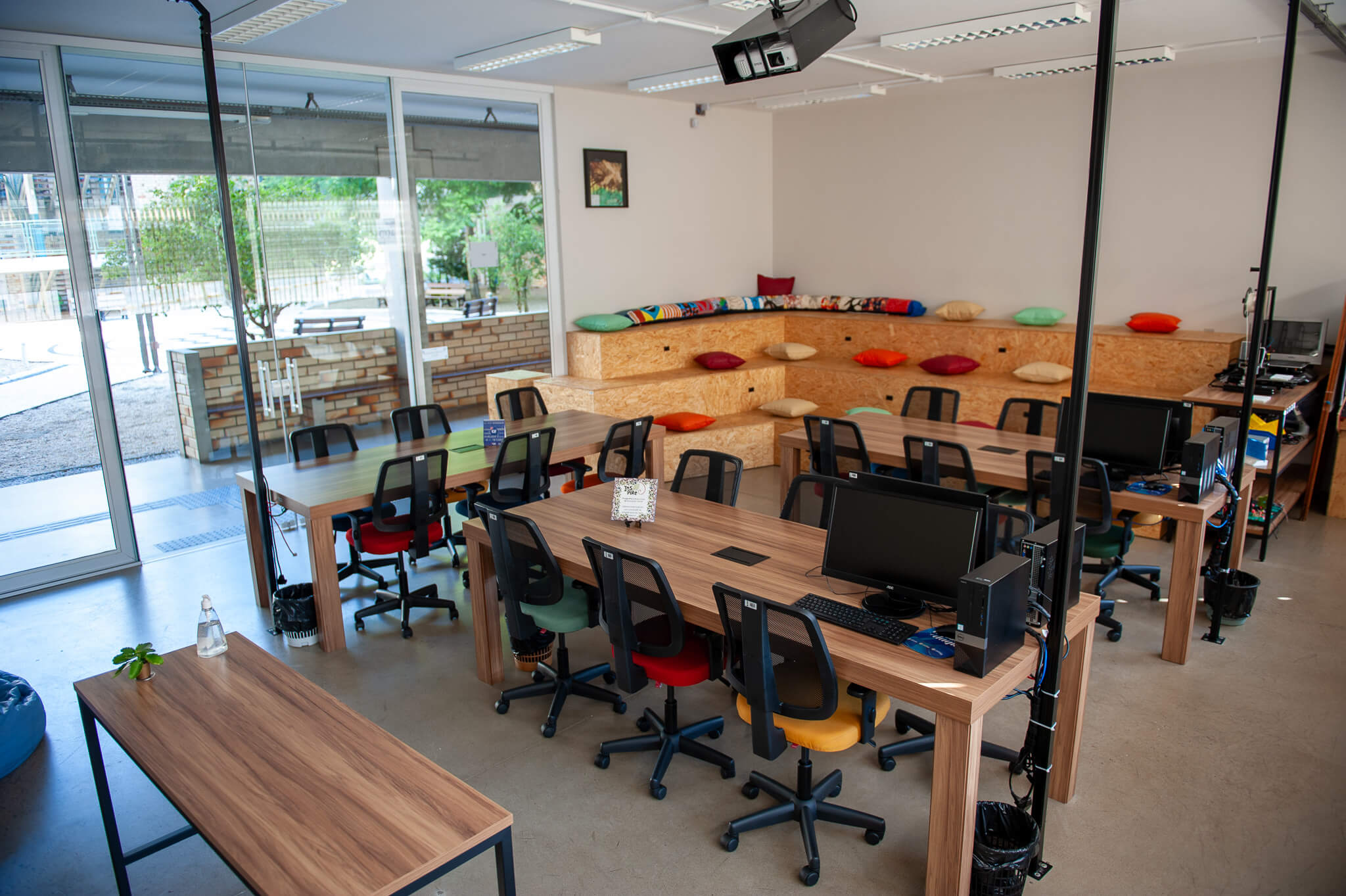 O espaço criativo conta com equipamentos adequados para o desenvolvimento de maquetes e projetos arquitetônicos.