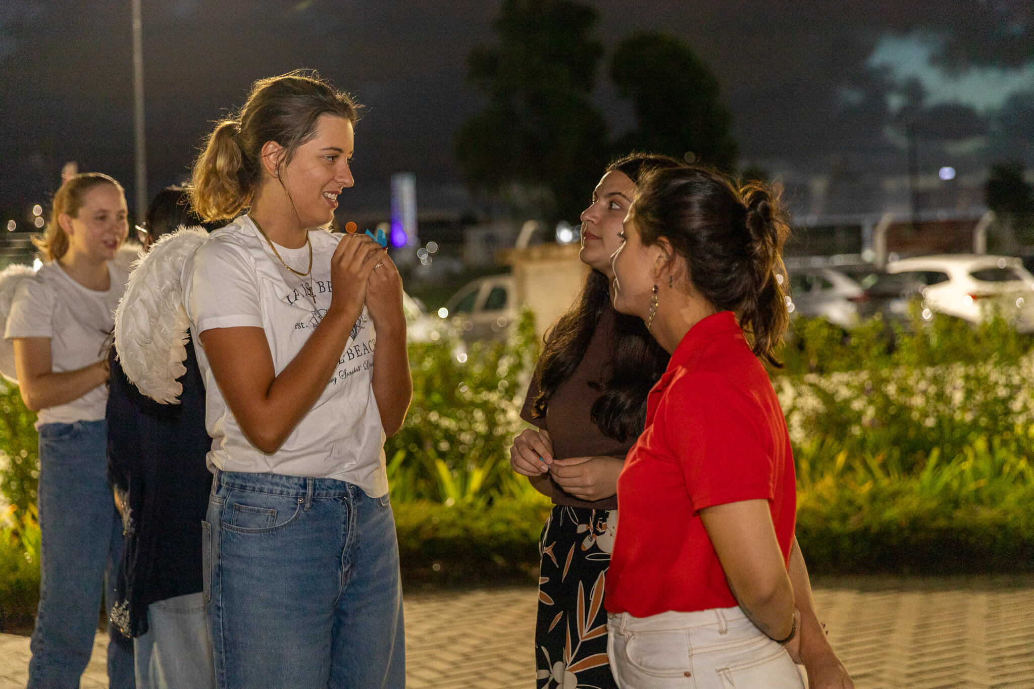 As turmas da primeira fase do Curso de Pedagogia da UNIFEBE foram recepcionadas de uma forma toda especial pelos veteranos do sétimo semestre na noite desta segunda-feira, 23, com o projeto Angel Friend. Trata-se de uma recepção já tradicional do curso, na qual a relação entre calouro e veterano se torna um vínculo de acolhimento e integração, desde os primeiros dias.