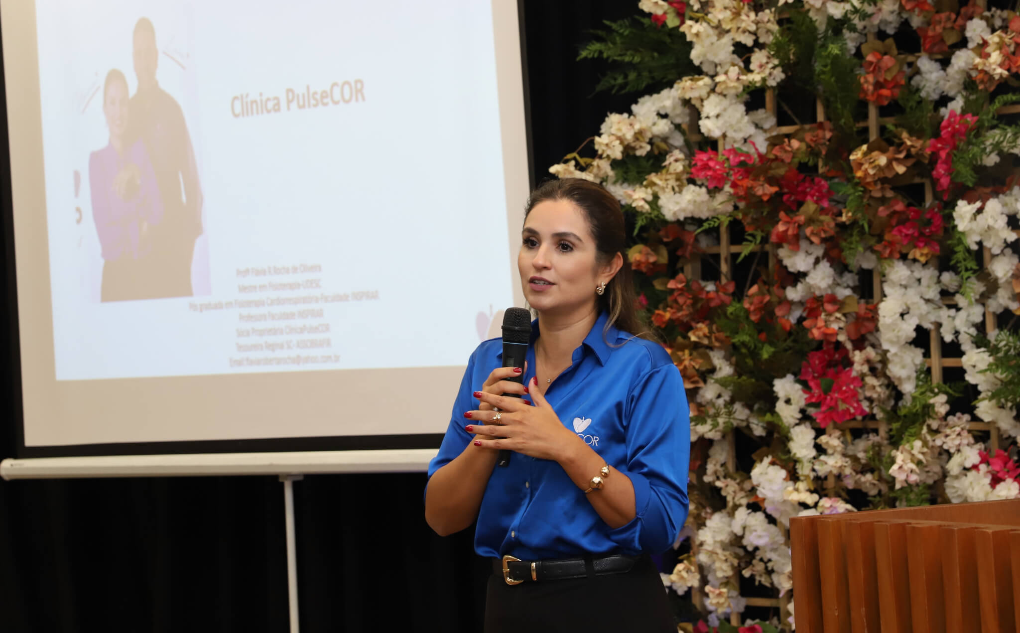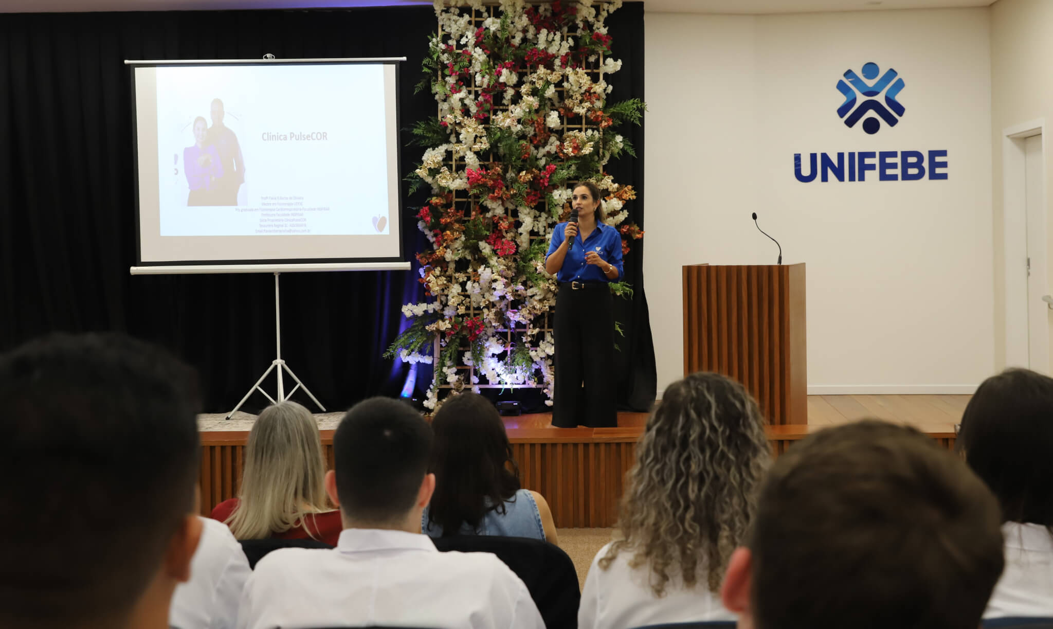 Convidada para ministrar a aula magna, a professora Flávia Roberta Rocha é fisioterapeuta formada pela Universidade do Vale do Itajaí (UNIVALI), com pós-graduação em Fisioterapia Cardiorrespiratória e mestre em Fisioterapia pela Universidade do Estado de Santa Catarina (UDESC). Em sua palestra, a professora abordou temas como a fisioterapia cardiorrespiratória e possibilidades de especialização e atuação profissional, incluindo relatos de sua trajetória na área.