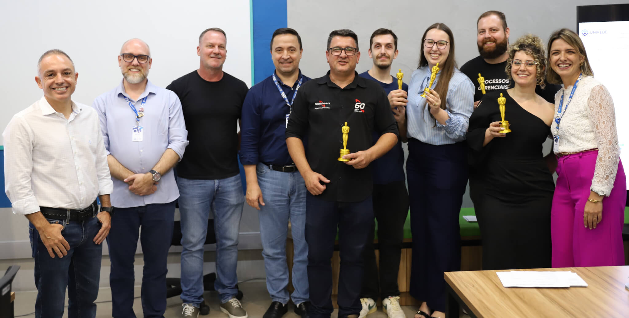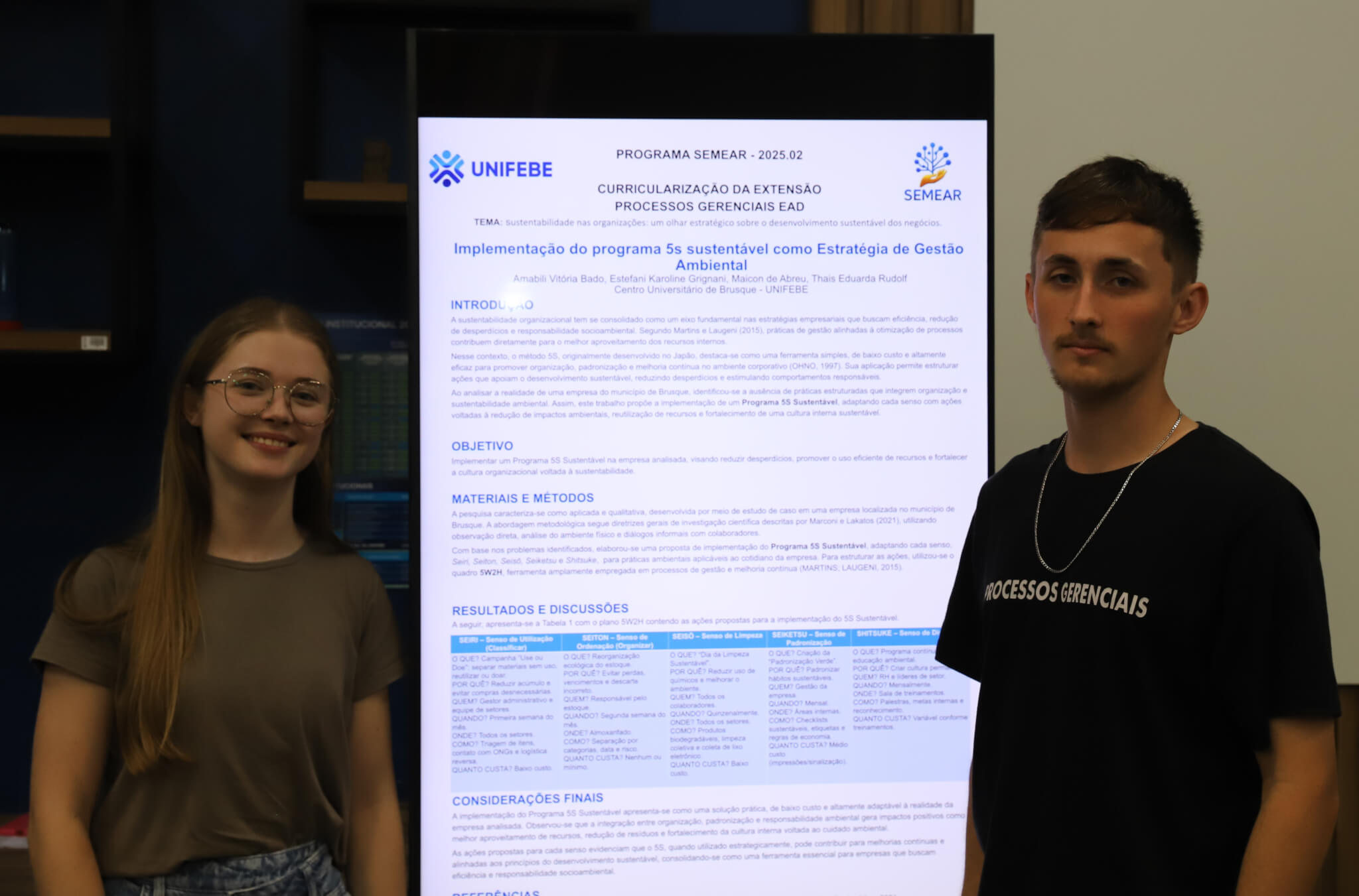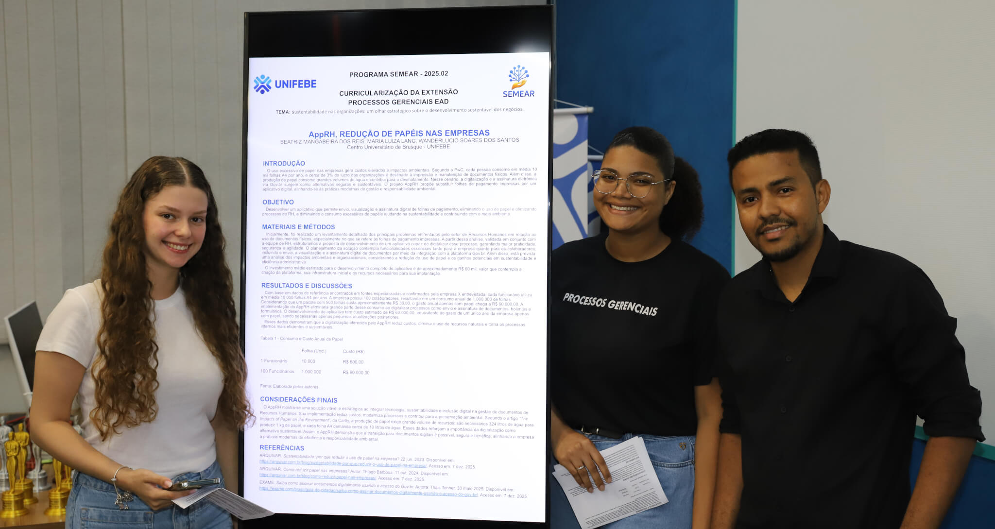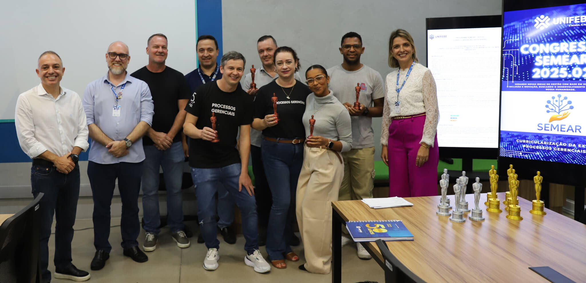 O Curso de Processos Gerenciais EaD da UNIFEBE teve uma noite de apresentações e reconhecimentos de trabalhos com a realização do Congresso SEMEAR nesta terça-feira, 9, no Laboratório Farol. Seis grupos de estudantes apresentaram projetos de soluções de sustentabilidade ambiental voltadas a empresas de Brusque e região, que foram avaliados pela comissão julgadora. Desses, três se destacaram e foram contemplados com troféus e prêmios.