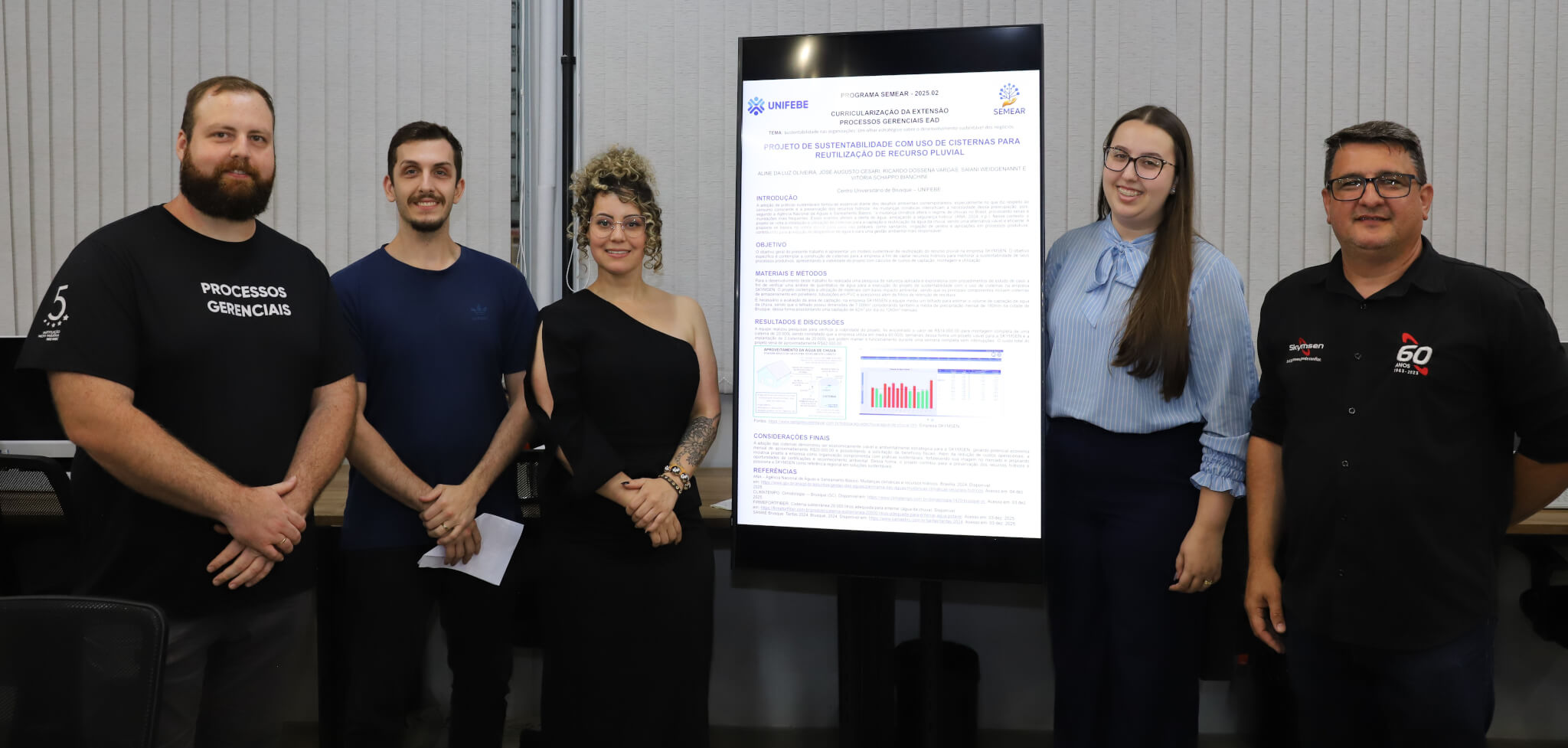 1.º lugar: Projeto de Sustentabilidade com Uso de Cisternas para Reutilização de Recurso Pluvial – Aline da Luz Oliveira, José Augusto Cesari, Ricardo Dossena Vargas, Saiani Weidgenant e Vitória Schappo Bianchini.