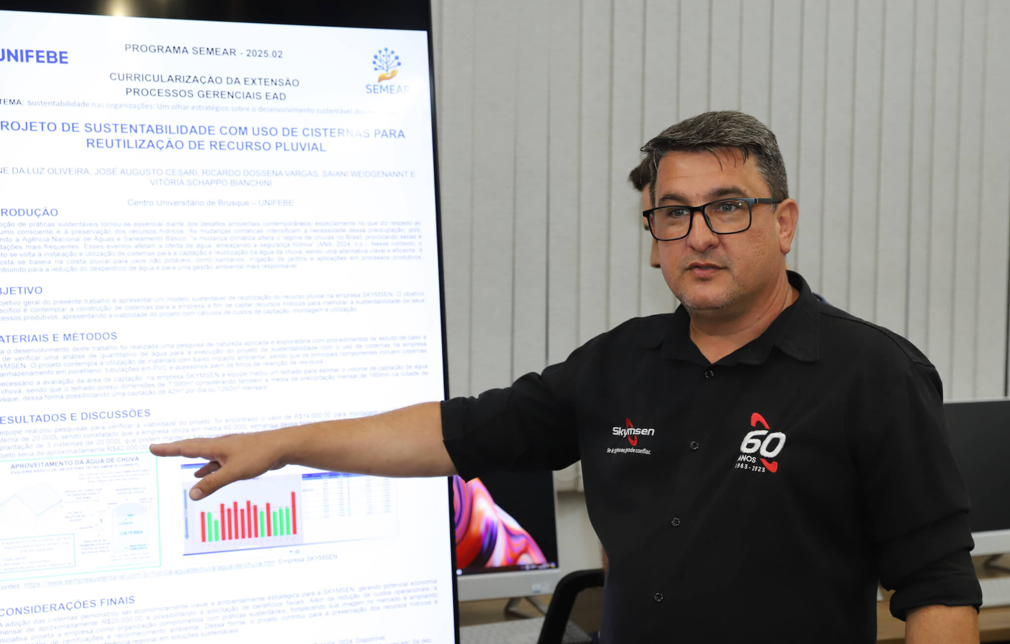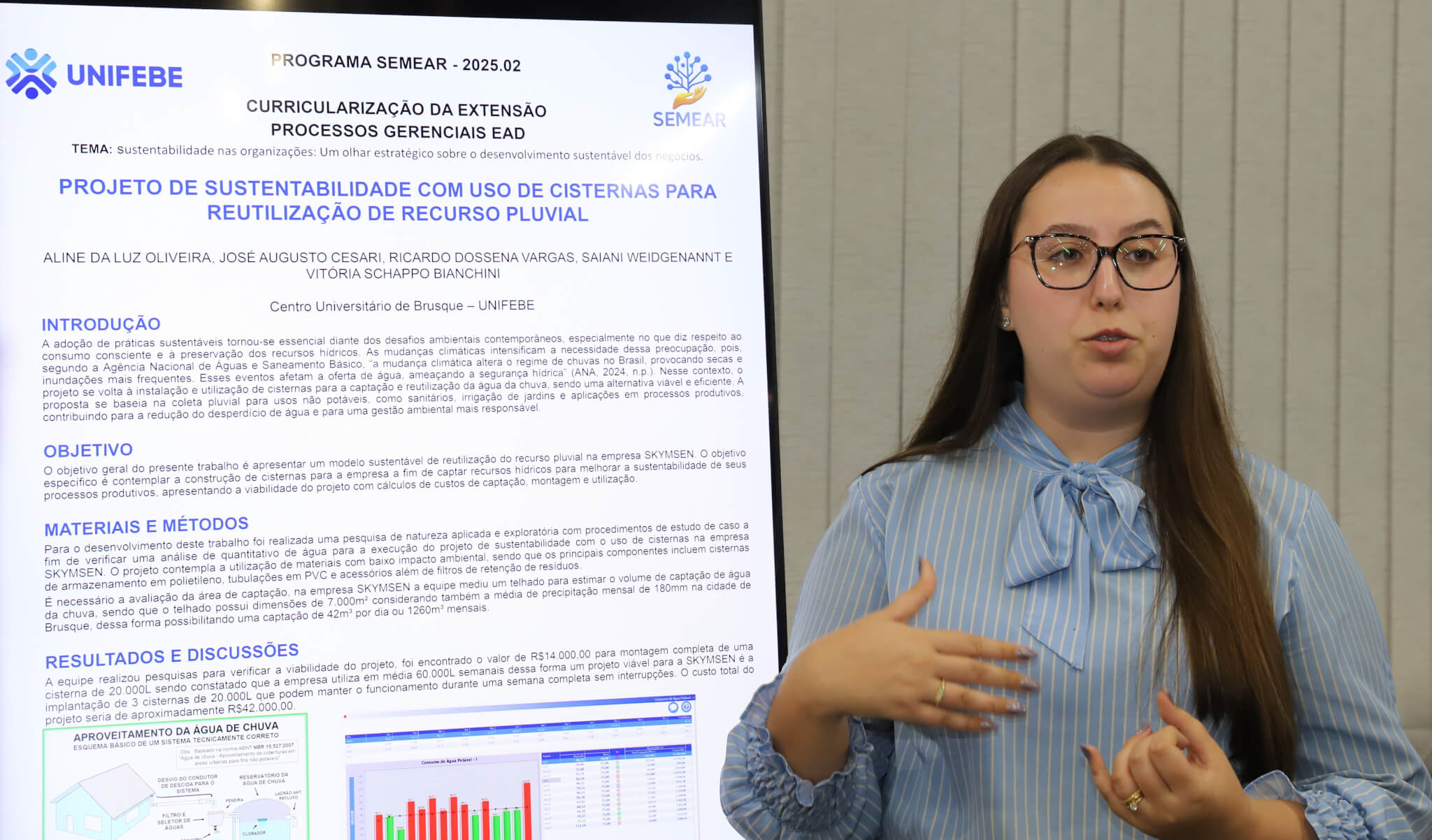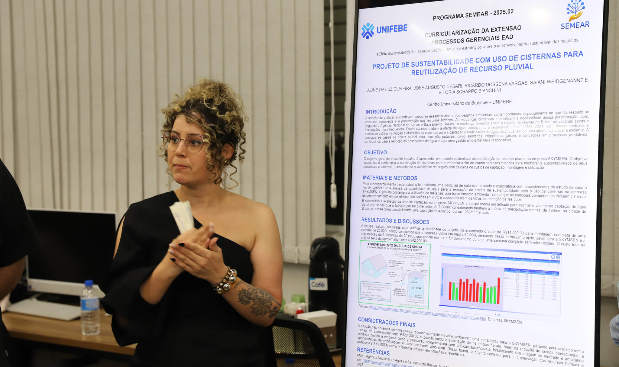 “Ele trouxe a ideia de fazermos o trabalho com base no uso de cisternas para trazer uma economia para a empresa. Então, fizemos toda a parte do projeto, de estudo de campo. E com os dados obtidos, montamos a proposta do trabalho. Projetamos a instalação das cisternas sobre uma ampla estrutura de telhado, verificamos qual seria a potencial economia da empresa. Trouxemos toda a questão de aquecimento global, mudanças climáticas, projeção das chuvas, da importância de utilizar esse recurso.”