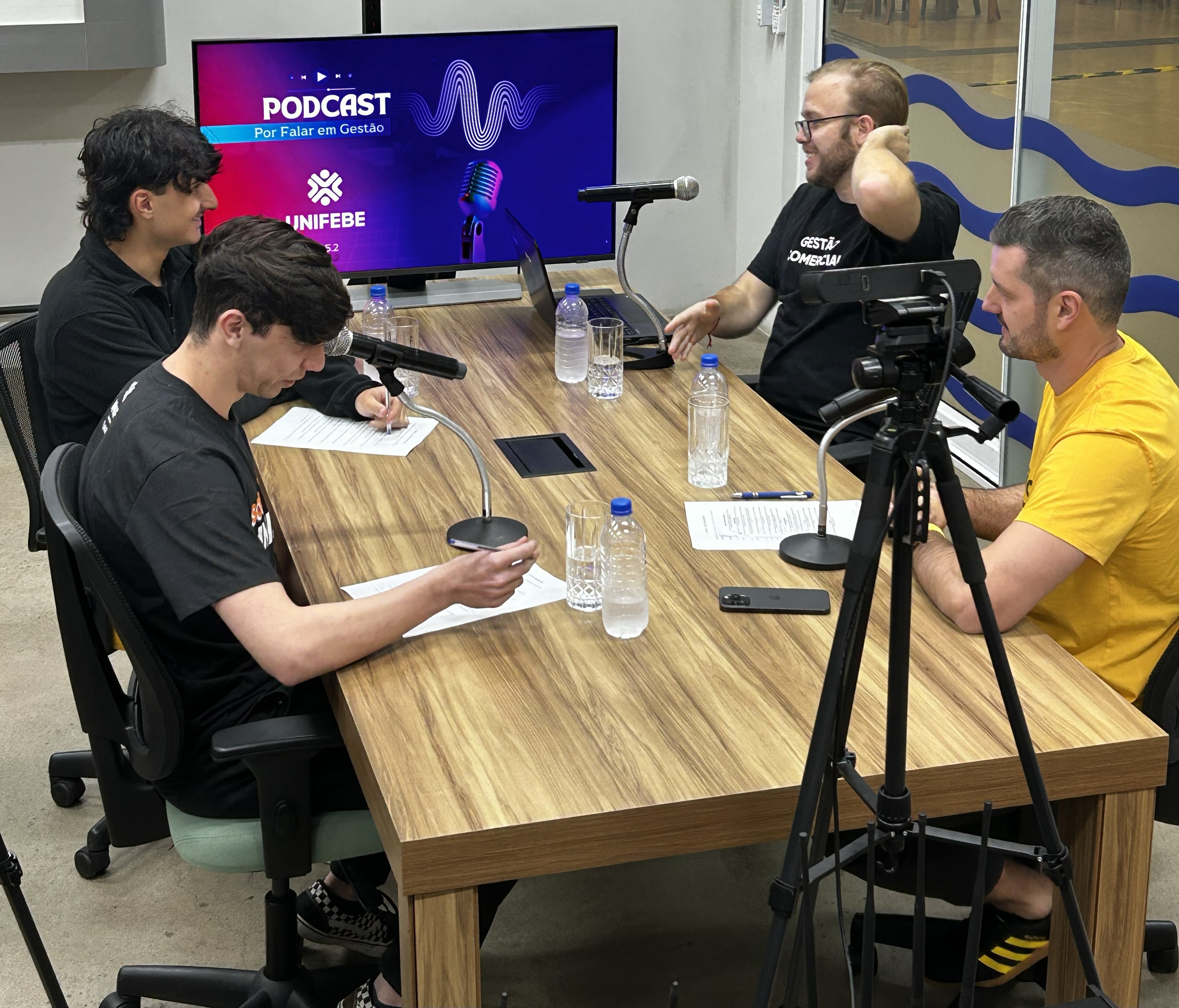 Os acadêmicos dos cursos de Administração, Gestão Comercial e Processos Gerenciais da UNIFEBE encerraram o semestre com a produção de 18 episódios do podcast “Por Falar em Gestão”, já disponíveis no YouTube e no Spotify. A iniciativa promove a aprendizagem prática por meio da criação, produção e operação de um podcast institucional, colocando os estudantes em contato com profissionais de diferentes áreas da administração e da inovação.