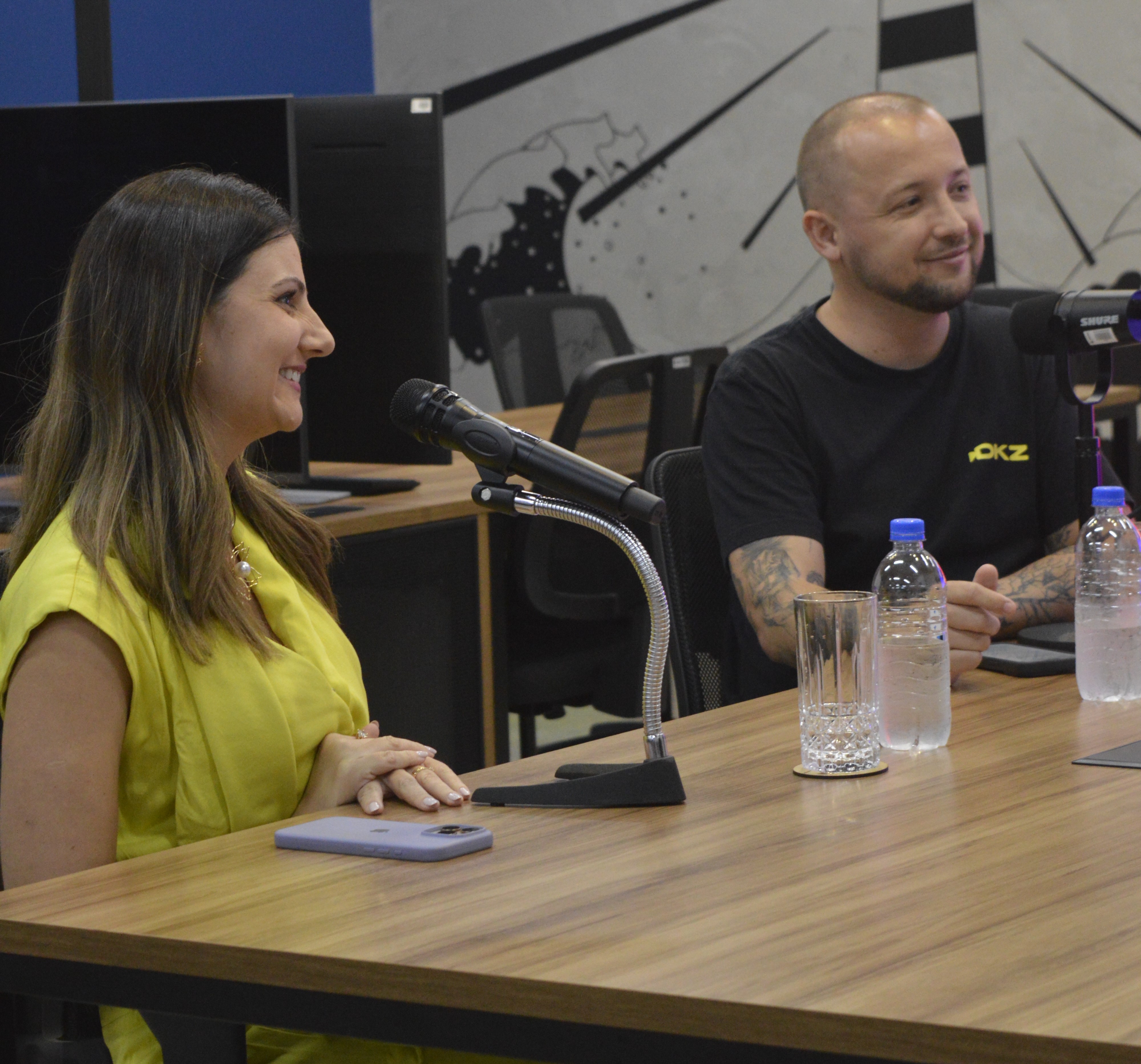 A edição do podcast Por Falar em Gestão, transmitida ao vivo em 17 de abril, foi de muito aprendizado e muita troca de conhecimentos sobre comunicação e posicionamento estratégico. Acadêmicos dos cursos de Administração, Processos Gerenciais, Design Gráfico, Publicidade e Propaganda e Tecnologia Educacional puderam participar e acompanhar uma conversa com os empresários Daiane e Felipe Rossano, responsáveis pela DKZ Produtora e pelo projeto Marca Que Fala.