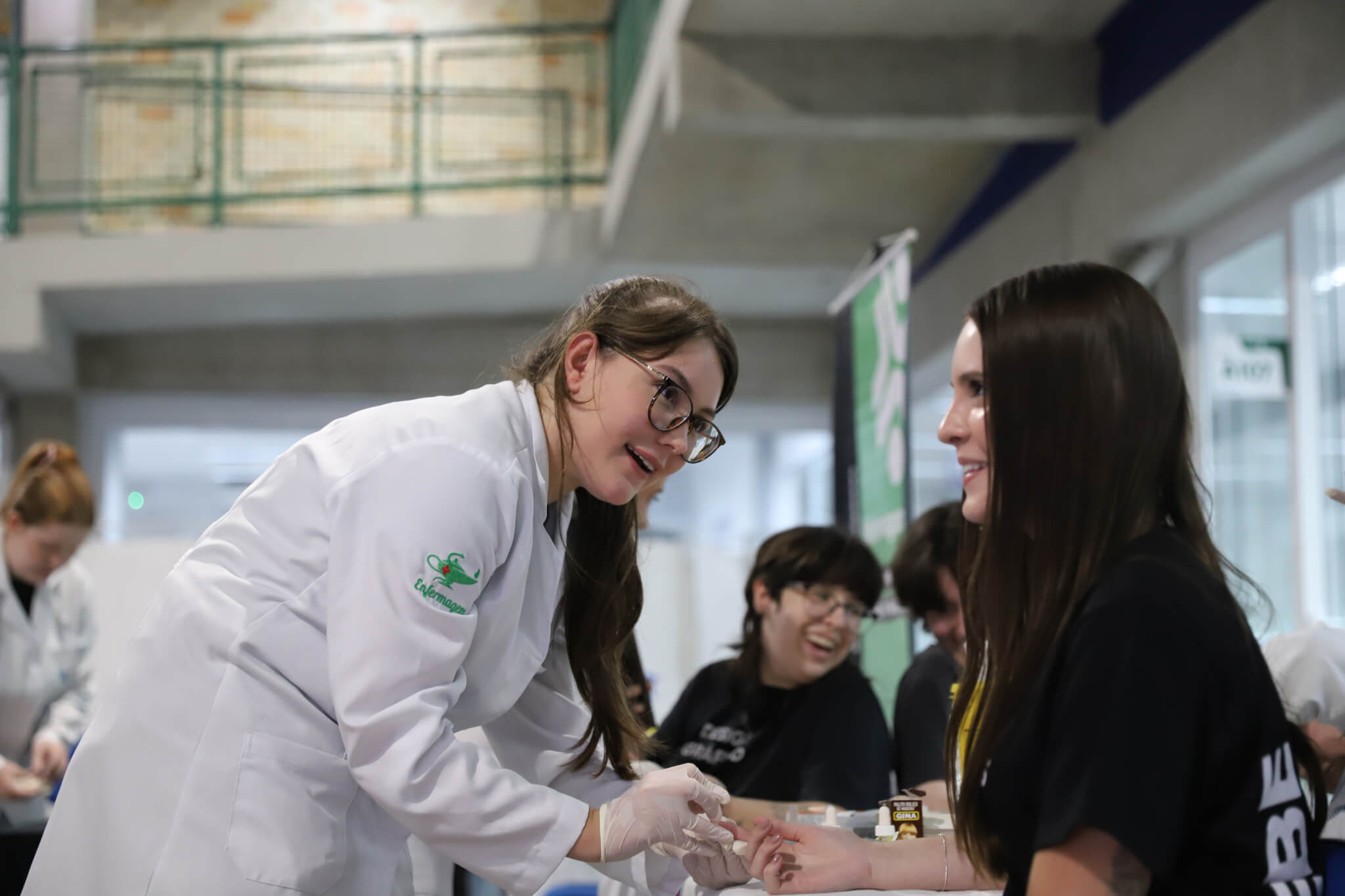 Na noite de quarta-feira (11), acadêmicas, professoras e técnicas administrativas receberam um tratamento especial no átrio do Bloco A. Em uma oficina, turmas do Curso de Enfermagem ofereceram aferição de pressão, glicemia capilar e tipagem sanguínea. Elas ambém orientaram o público sobre doação de sangue e prevenção de câncer de pele.