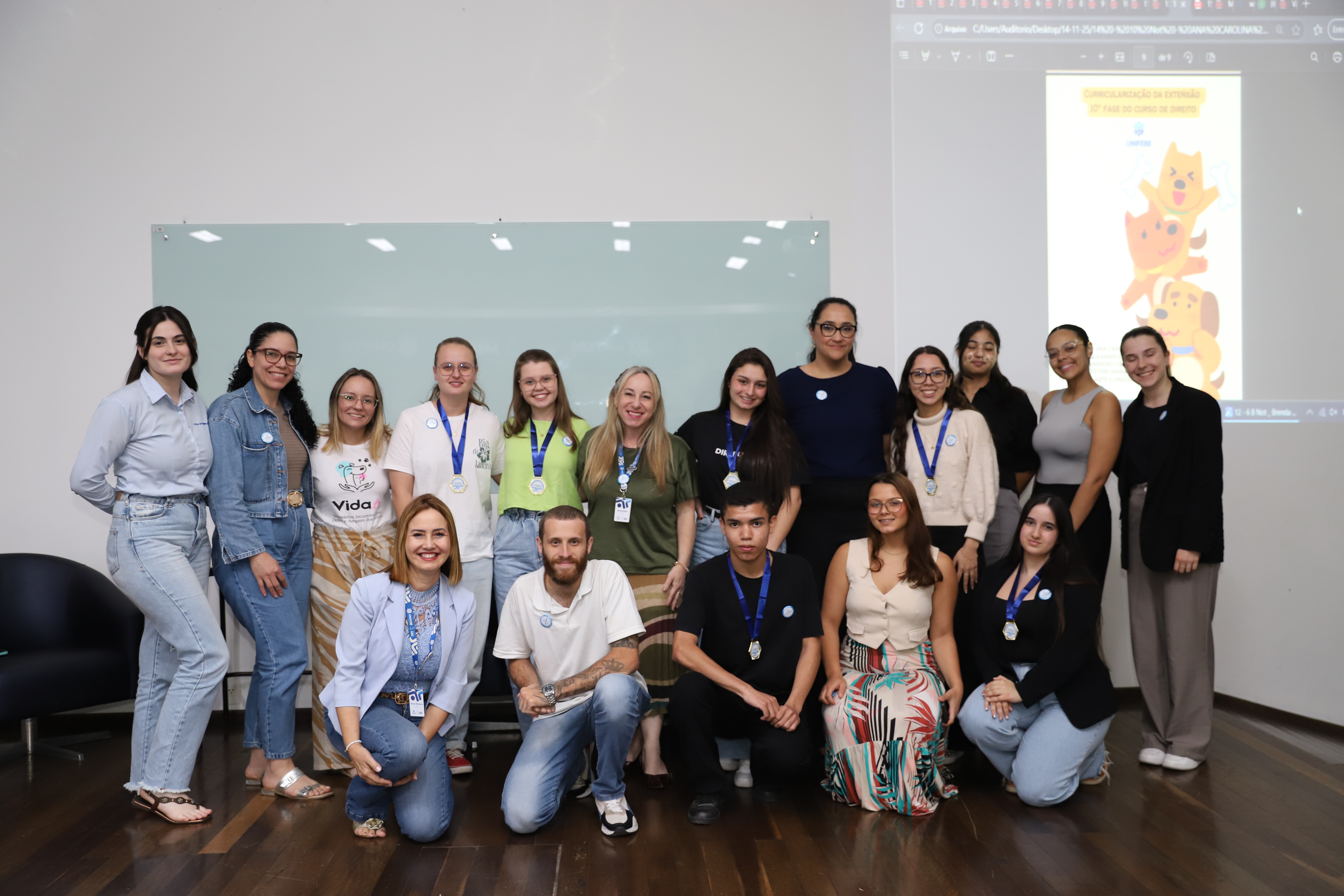 Está concluída a curricularização da extensão do Curso de Direito da UNIFEBE no semestre 2025.2: sob a temática central do direito animal, os trabalhos que mais se destacaram foram apresentados na noite desta sexta-feira (14), no auditório do Bloco C. Ao todo, foram 16 grupos que receberam medalha e botton de Destaque por desenvolverem trabalhos que abordaram a adoção de animais , maus-tratos, microchipagem, políticas públicas, ONGs e castração, entre outros assuntos.