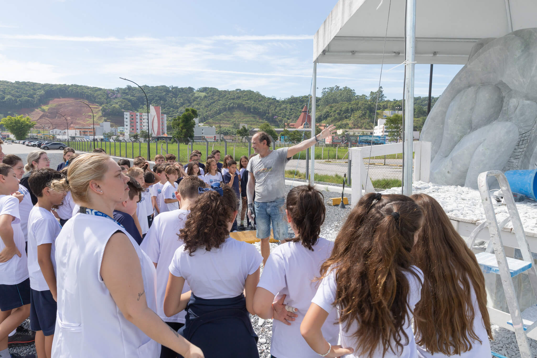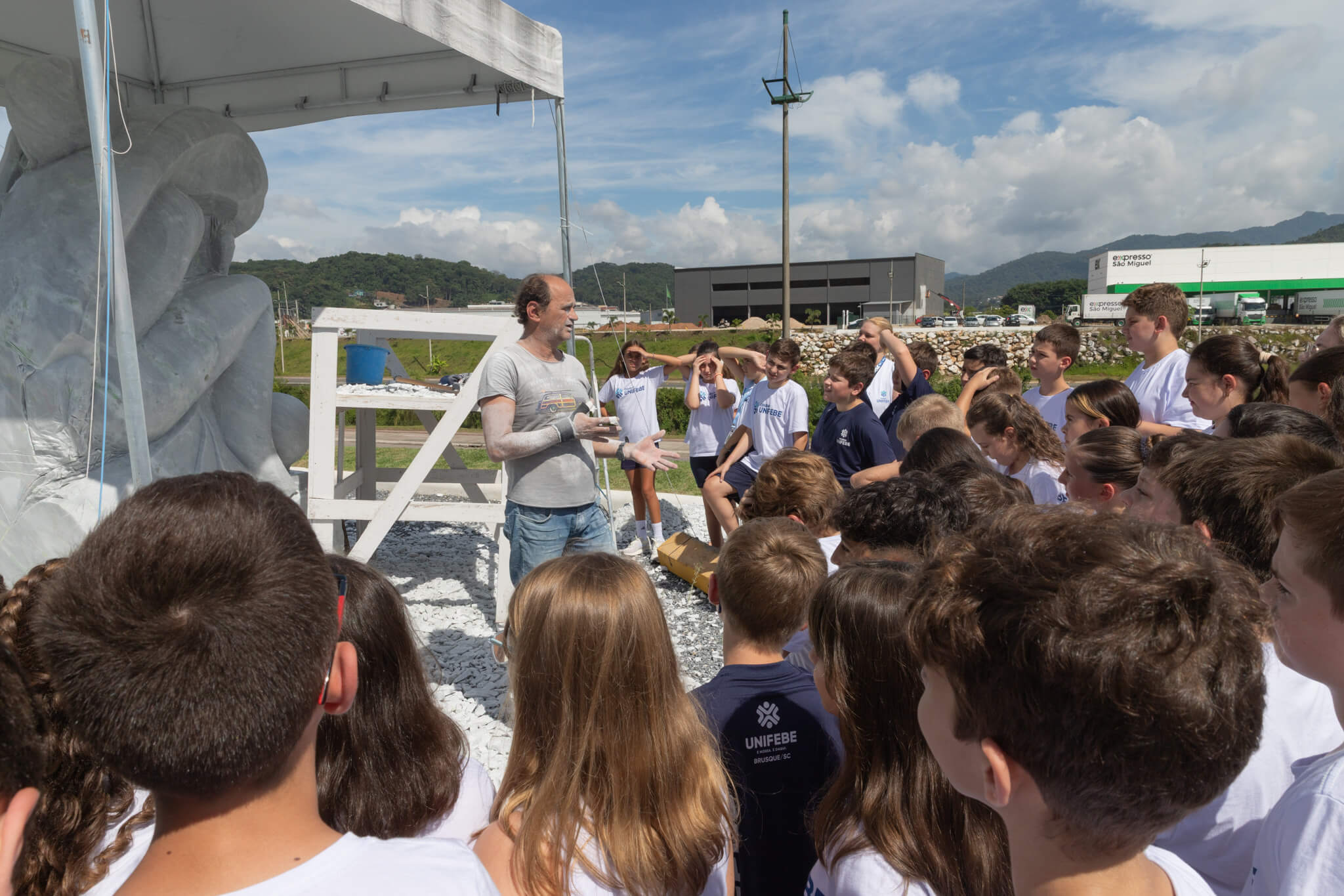 “Quando soubemos da oportunidade de conhecer o escultor que estava no campus produzindo a nova obra, entendemos que seria uma oportunidade perfeita para conectar o conteúdo à prática”, relata a coordenadora do Ensino Fundamental I, Janice Olienik. “Para nós, é muito significativo saber que existe essa extensão histórica e cultural dentro da própria instituição e poder proporcionar esse contato direto com a arte. A aprendizagem acontece de forma muito mais profunda quando a criança vivencia o que está estudando”.