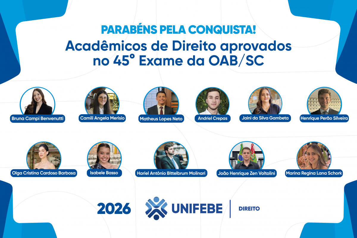 O curso de Direito da UNIFEBE teve mais 11 acadêmicos aprovados no exame da Ordem dos Advogados do Brasil (OAB), realizado no segundo semestre de 2025. Com a aprovação, os estudantes e bacharéis em Direito estão legalmente aptos a advogar no país.